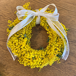 たっぷりのミモザで作るふわふわリース この時期限定の人気なワークショップ 制作後はドライフラワーとして約半年ほどお楽しみいただけます♪ ワークショップ後は手作りケーキをご用意しております Sサイズ 土台φ20センチ(完成は約25~30センチ)
